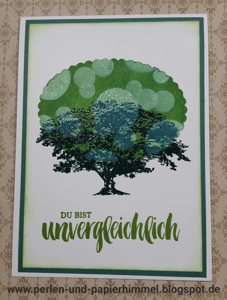 Die Karte beinhaltet gleich mehrere Komponenten, nämlich die Maskiertechnik, die Wischtechnik, das Embossen (der Baum) und eben auch die Bokeh-Technik.