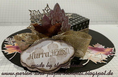 Der Hut an sich ist aus einem großen Kreis und der Fensterschachtel von Stampin Up entstanden. Dekoriert habe ich ihn mit einer Schleife und ausgestanzten und gestempelten Blättern mit der „Babywipe-Technik“. Ein Label drauf und schon ist mein Deko-Hut fertig.