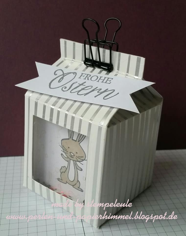 Diesen Milchkarton mit Sichtfenster habe ich (ohne Stanzform) mit dem tollen SAB-Papier gewerkelt. Das Fenster ist ein Schüttel-Element. Das hat mich richtig Nerven gekostet, aber ich finde es sehr gelungen.