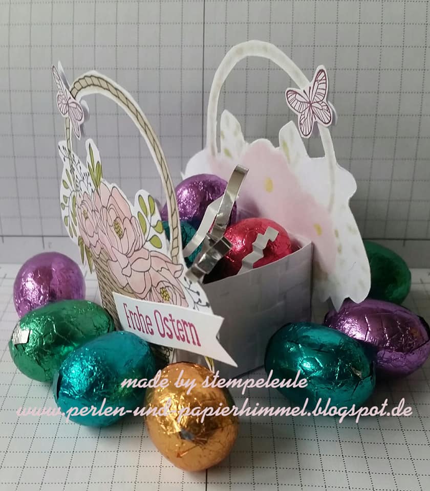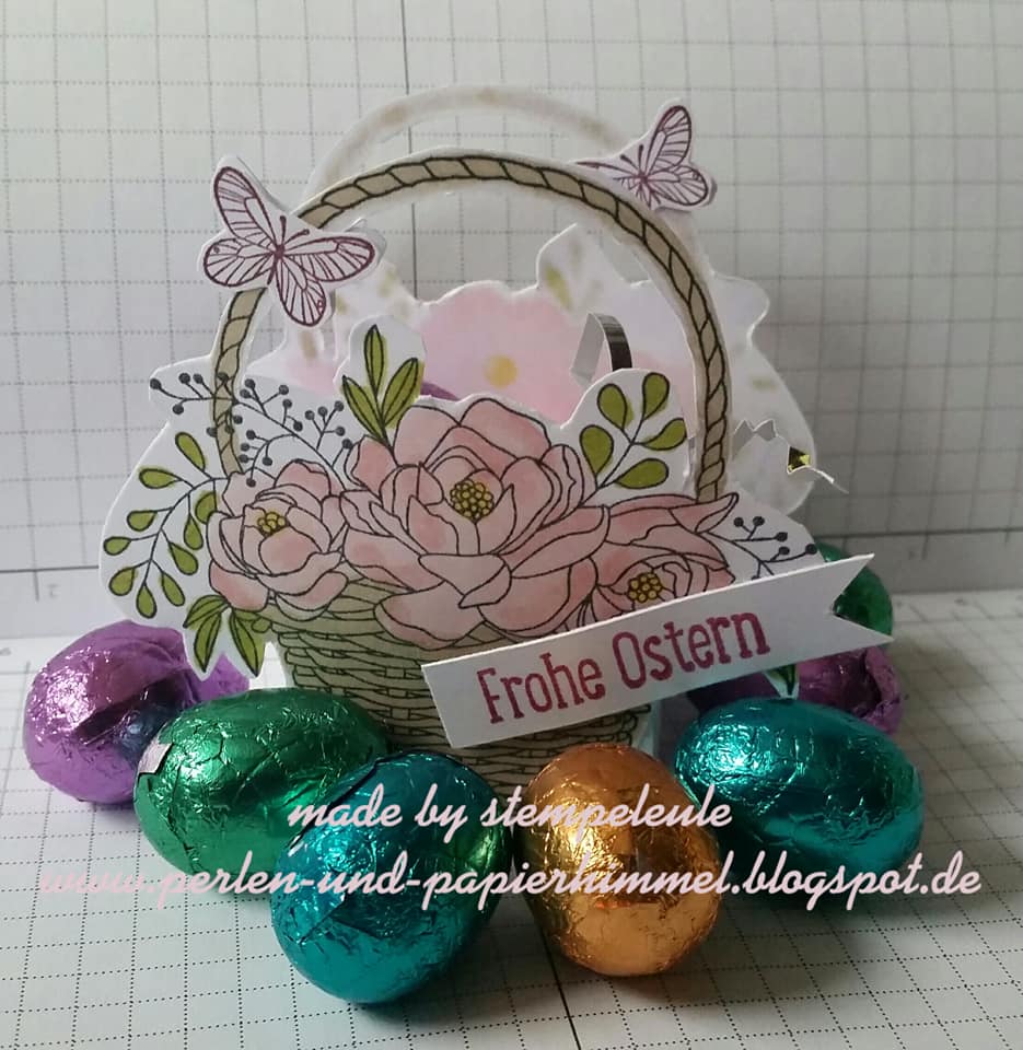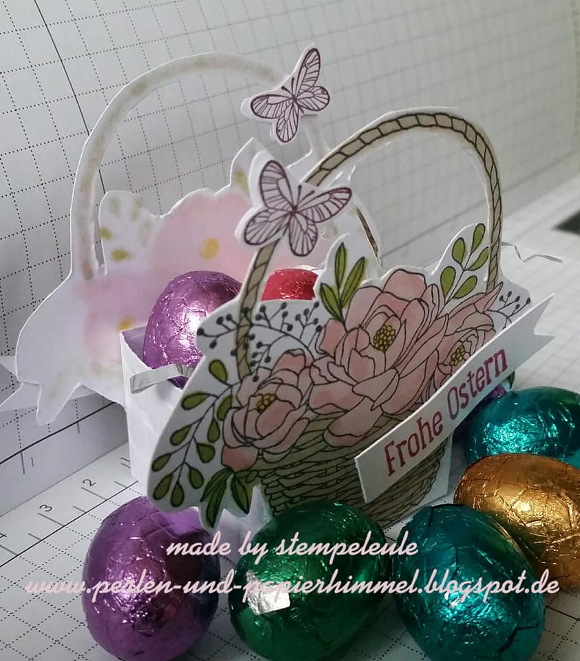 Dieses kleine Osterkörbchen ist mit dem SAB Set „Blumenkorb“ und der passenden Prägeform „Korbgeflecht“ entstanden. Coloriert habe ich das Körbchen mit den Stampin Blends.