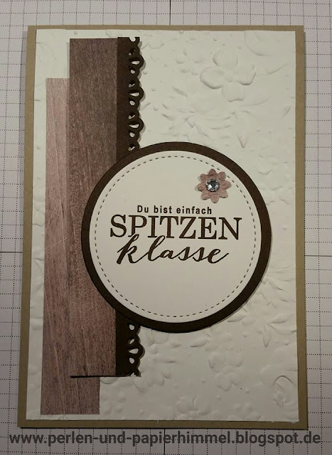 Die Kartenbasis ist mein geliebtes Savanne, darauf ein Stück Cardstock in Flüsterweiss geprägt mit dem neuen SAB Prägefolder, zwei Streifen des DSP „Holzoptik“ und eine Bordüre in Espresso. Der gestitchte Kreis in Flüsterweiss ist mit einem weiteren Kreis in Espresso hinterlegt. Den Spruch finde ich sooo wunderschön. Ein kleines Blümchen mit Strass-Stein auf dem DSP „Holzoptik rundet das Ganze ab.