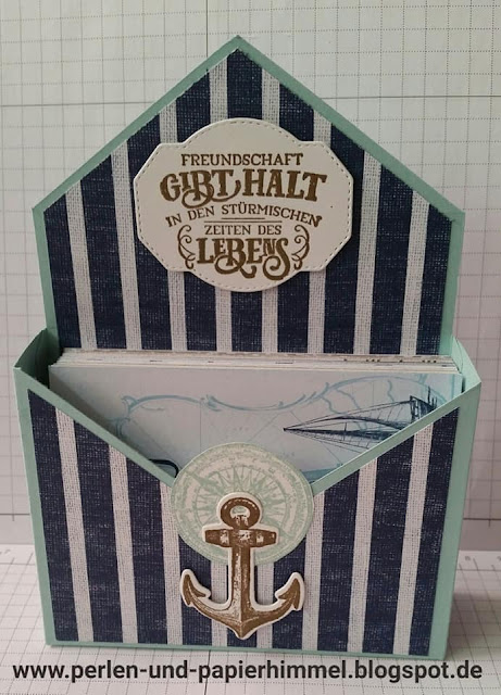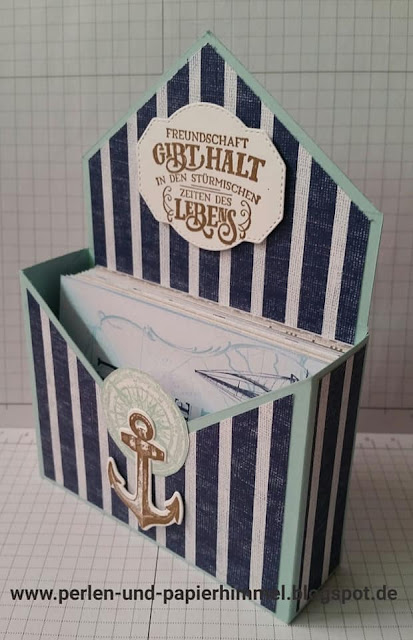 Und dazu passend habe ich noch eine Aufstellkarte (Pop-Up Faltkarte) nach einer Anleitung von Bastelhexchen gewerkelt – natürlich auch im maritimen Stil