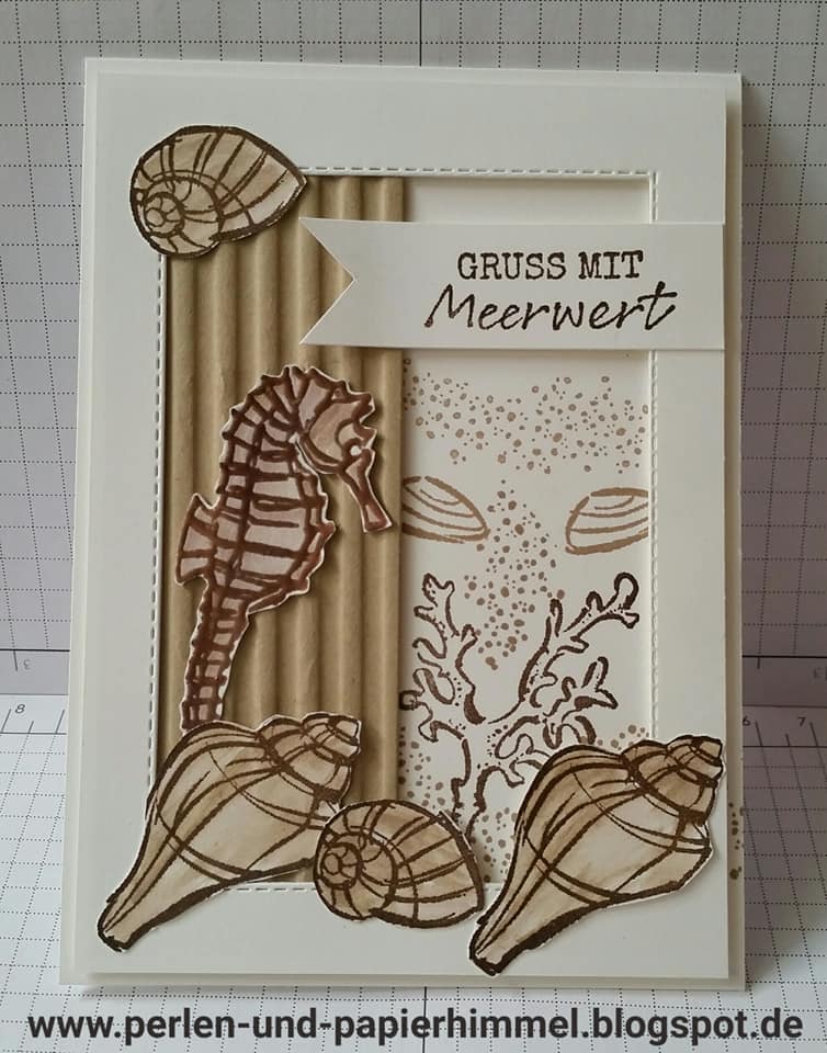 Als erstes zeige ich dir eine Karte, die ich in den Farben Savanne und Espresso mit dem Stempelset „Mit Meerwert“ gewerkelt habe: