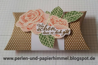 Verpackung Nummer zwei ist eine sandfarbene Kissenschachtel, die ich mit neuem DSP, Banderole und Spruch verziert habe.