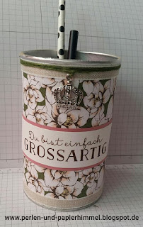 Als erstes habe ich eine Chipsdose upgecycled zu einem Stiftebecher. Den werde ich mit ins Büro nehmen.