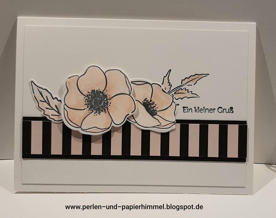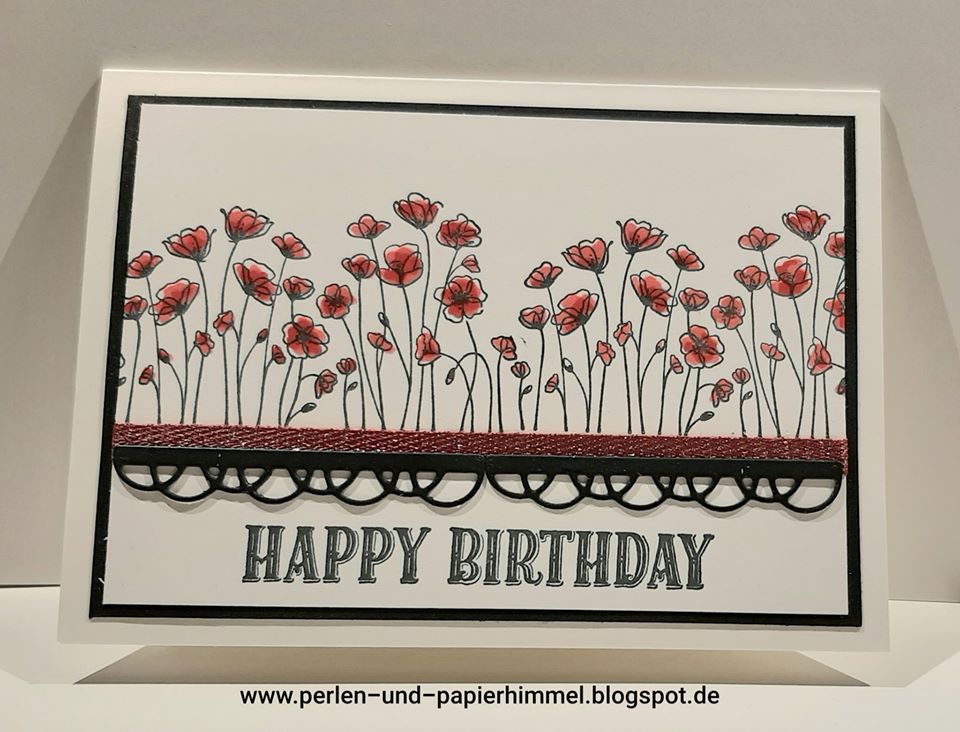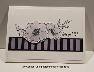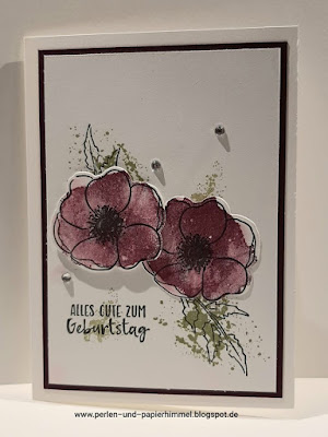 dann habe ich mich bei dieser Karte mit meinem neuen Stempelkissen in himbeerrot ausgetobt. Die Mohnblüten sind leicht mit dem Wink of Stella beglittert.