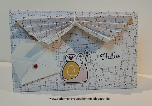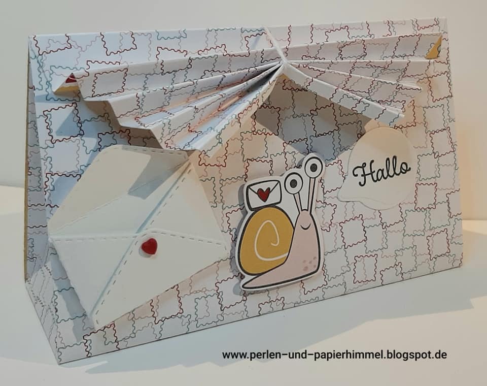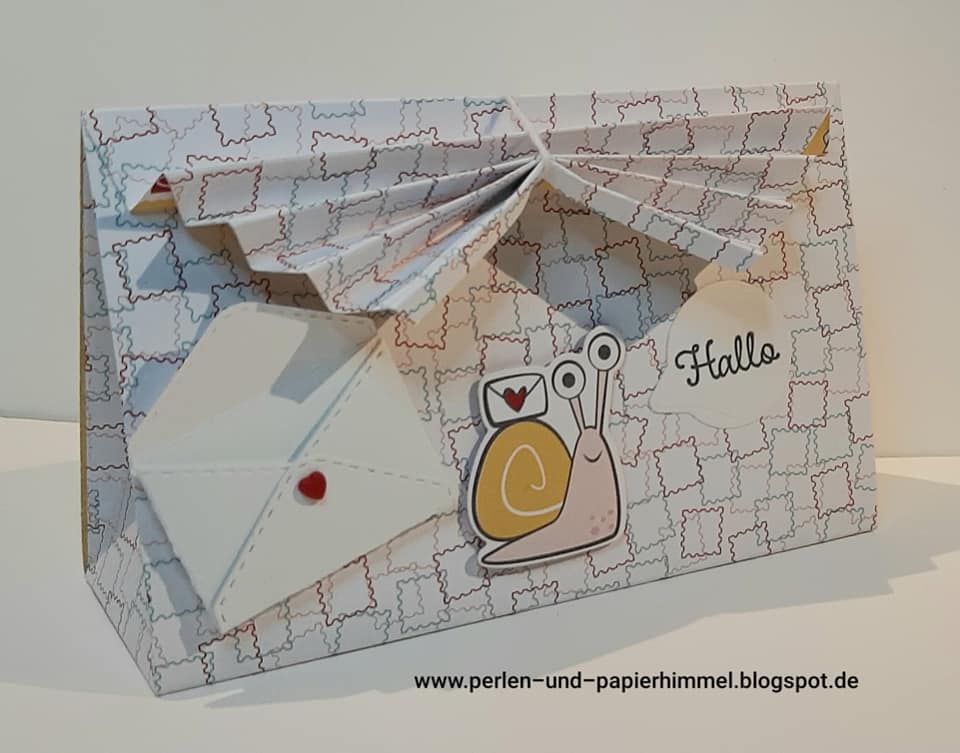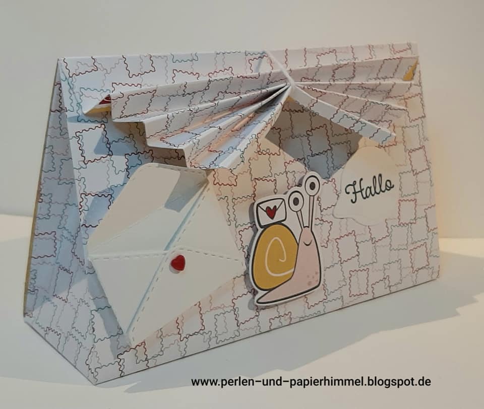 Ich habe mir die Schneckenpost vorgenommen und damit eine Plissee-Box gebastelt. Die Idee dazu habe ich bei https://stempelfantasie.com/ gefunden.