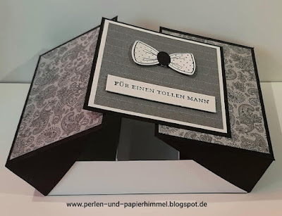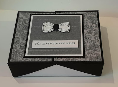 Ich habe eine Flip-Top-Box für einen Mann gewerkelt nach einer Anleitung von René Günther. Durch die Unterteilung im Innern der Bos finden kleine Reisegrößen von Pflegeprodukten für den Mann von heute Platz. Schaut mal: