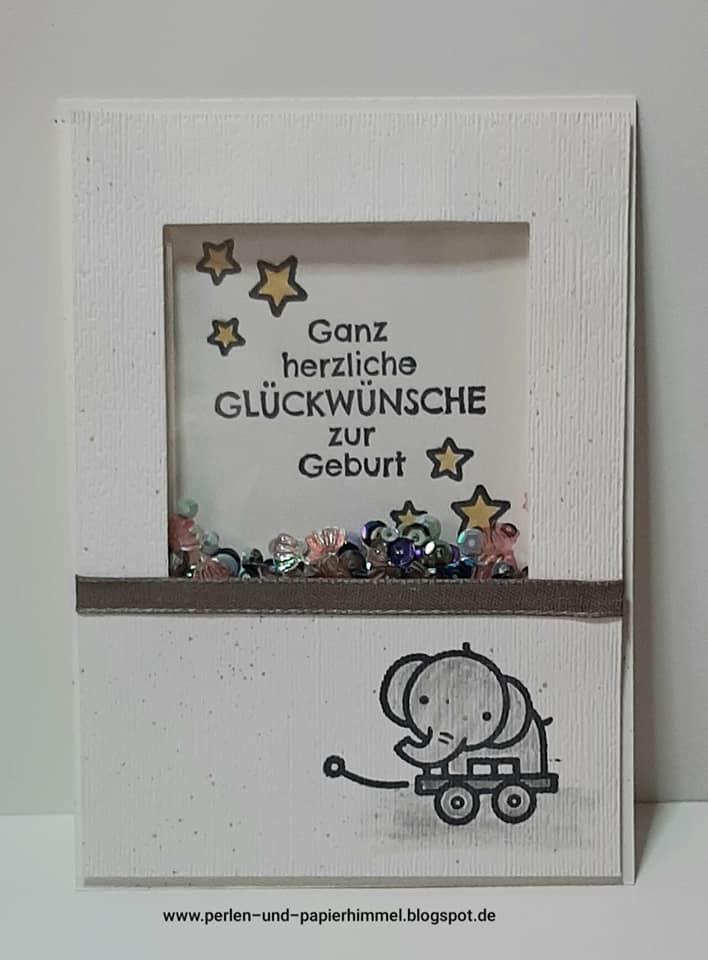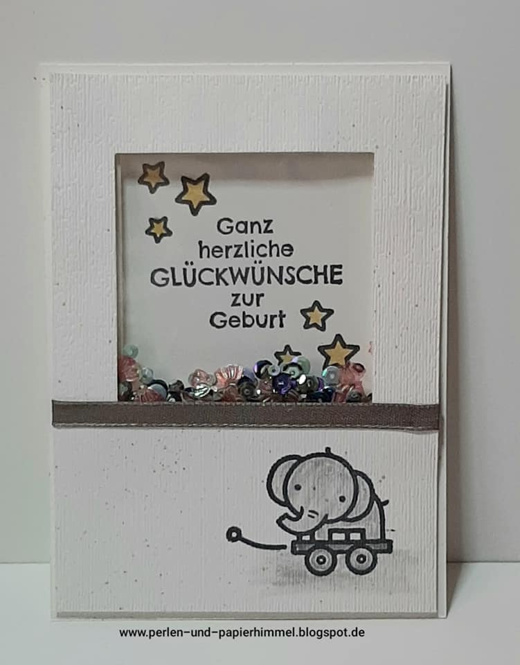 Ich habe eine Schüttelkarte zur Geburt gewerkelt mit dem Stempelset „Verspieltes zur Geburt“ aus dem
