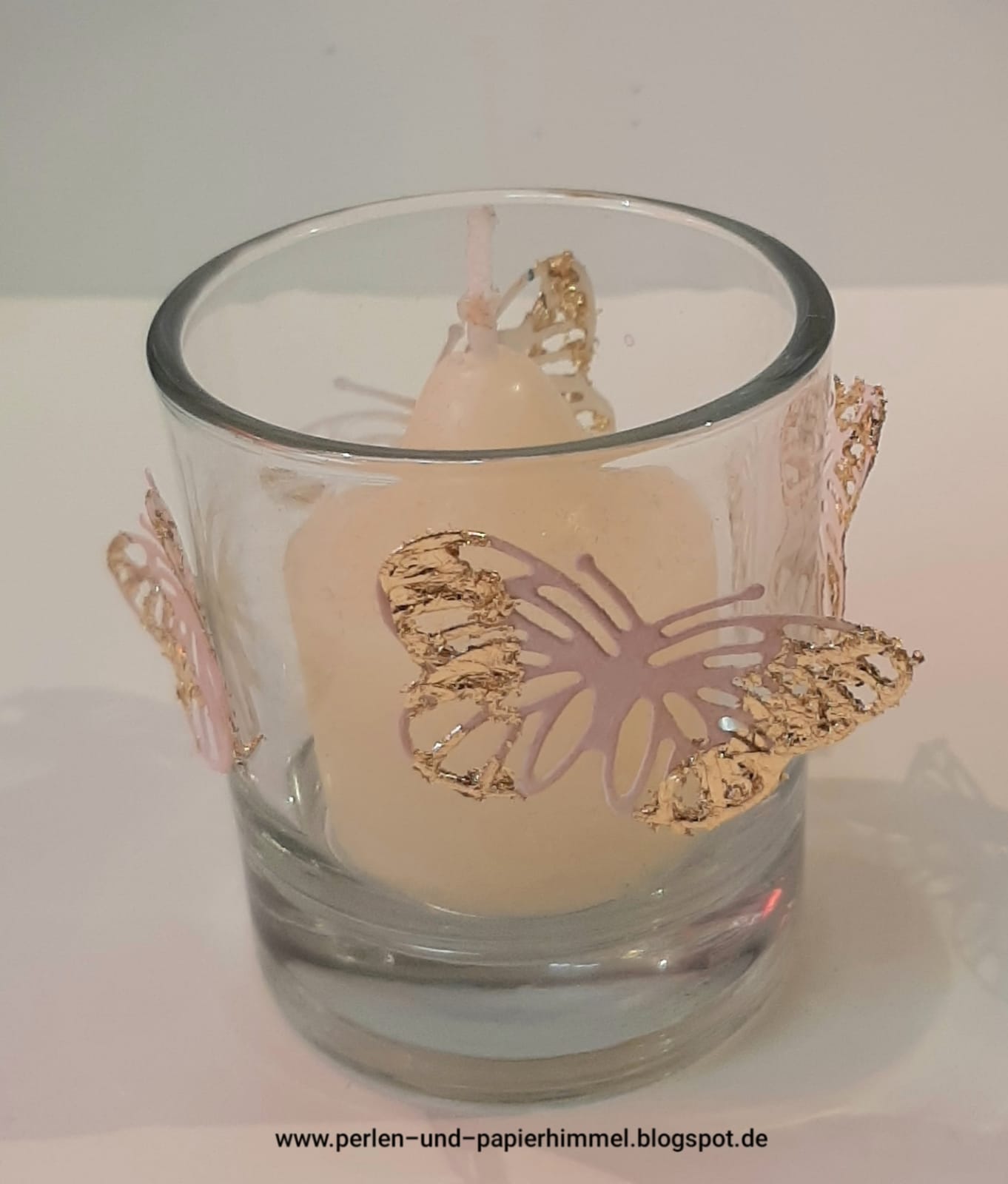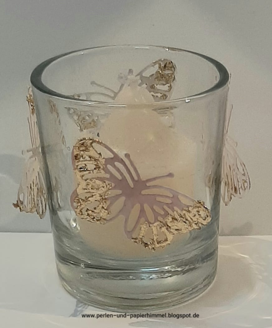 Ich habe ein kleines Teelichtglas mit unseren wunderschönen Schmetterlingen dekoriert.