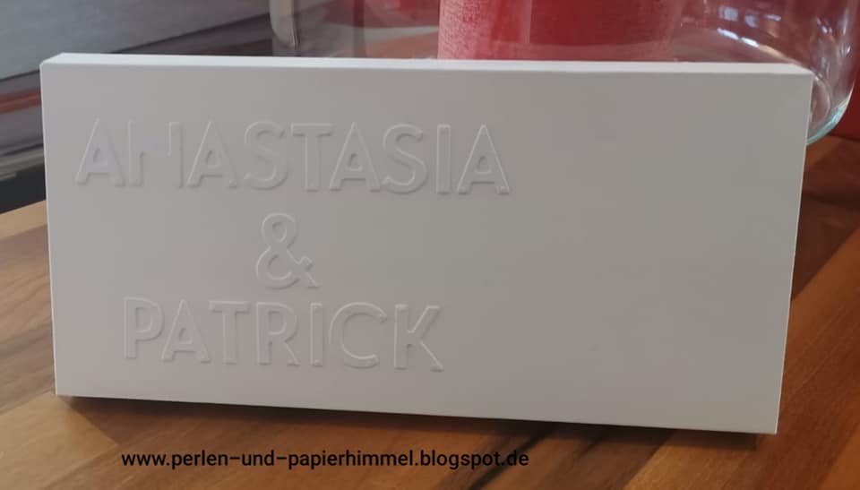 Hier als erstes die Umverpackung in Grundweiss mit den Namen des Brautpaares: