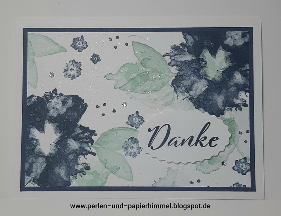 Verwendet habe ich Cardstock in Grundweiss, Cardstock in Abendblau, Stempelset „Kunstvoll Koloriert“, Stempelfarben Aquamarin, Abendblau und Marineblau, Basic-Strass-Schmuck sowie die Stanzen Oval-Duo und Stanze nach Wahl Allerliebste Anhänger.
