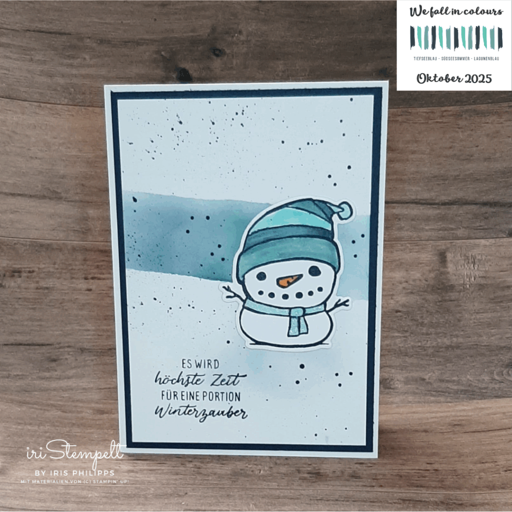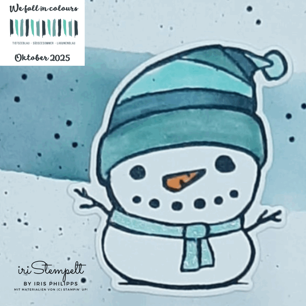 Begonnen habe ich mit einer Grundkarte in Grundweiss mit einer Mattung in Tiefseeblau. Auf dem dann folgenden Aufleger in Grundweiss habe ich dann mit der Gestaltung begonnen. Zuerst habe ich einen Teil mit unserem Abdeckmaskenpapier abgeklebt und dazwischen mit den Blendingpinseln in den drei Farben gewischt. Dann habe ich ein paar Sprenkel in Tiefseeblau aufgebracht und den süßen Schneemann aus dem Stempelset „Festive Friends“ gestempelt und in den drei Farben in Aquarelltechnik coloriert. Der Schal vom Schneemann ist leicht mit dem Wink of Stella beglitzert. Das fertige Motiv habe ich mit Dimensionals aufgeklebt und final den Spruch in Tiefseeblau dazu gestempelt.