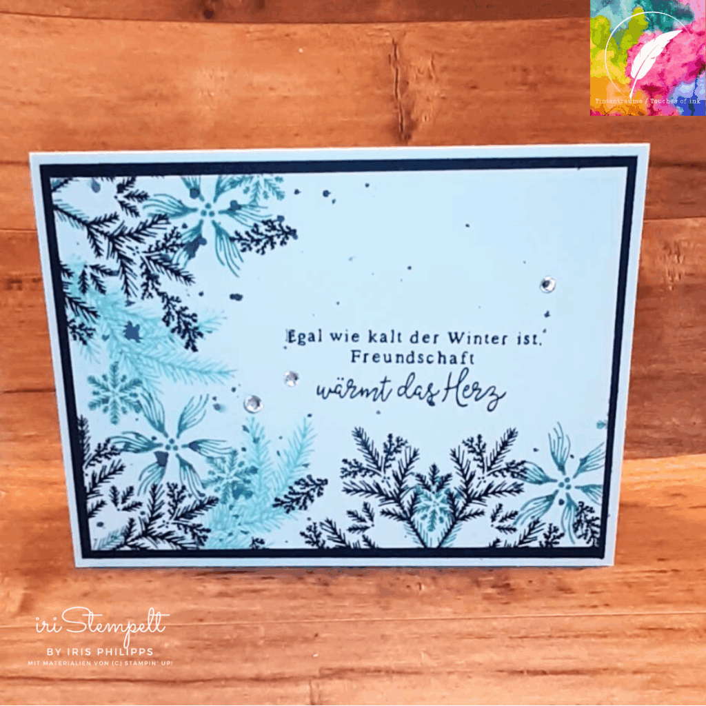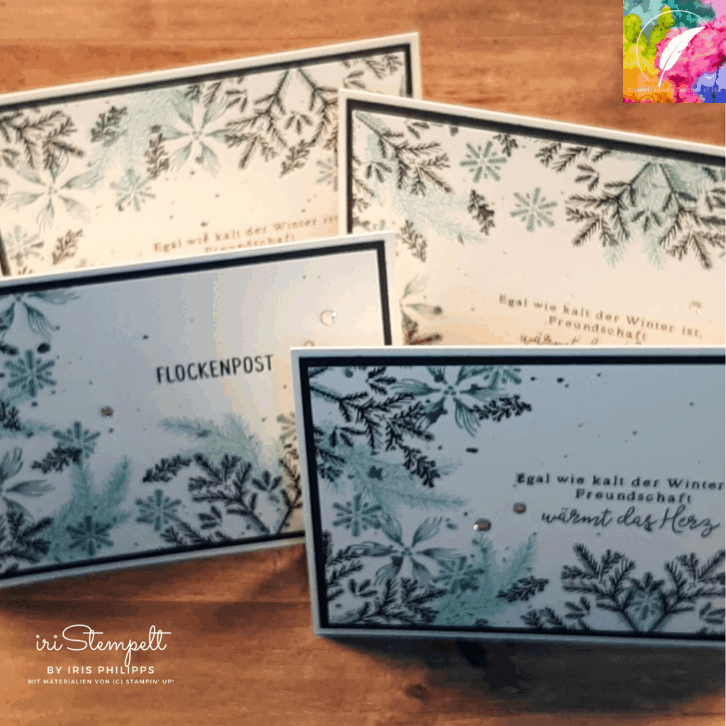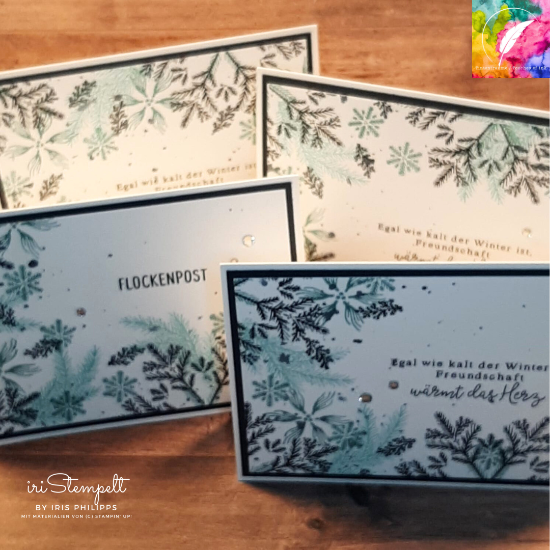 Für meine vier Karten habe ich mir einen A4-Bogwn Grundweiss hergenommen und diesen an der kurzen Seite bei 10,5 cm und an der langen Seite bei 14,85 cm gefalzt. So entstehen wir Sektionen. Dann habe ich mit den Farben Tiefseeblau, Glücksgrün und Lagungenblau entlang der Falzlinien die Motive aus dem Stempelset „Zauberhafte Tannenzweige“ gestempelt und mit einigen Sprenklern ergänzt. Danach habe ich den Bogen an den Falzlinien auseinandergeschnitten und so 4 Kartenaufleger erhalten. Diese habe ich noch auf das Maß des zweiten Auflegers in 9 mal13 cm zugeschnitten und auf den 1. Aufleger mit den Maßen 9,5 mal 13,5 cm in Tiefseeblau aufgebracht. Ein Spruch und ein paar Basic-Strasssteine runden meine Karten ab.