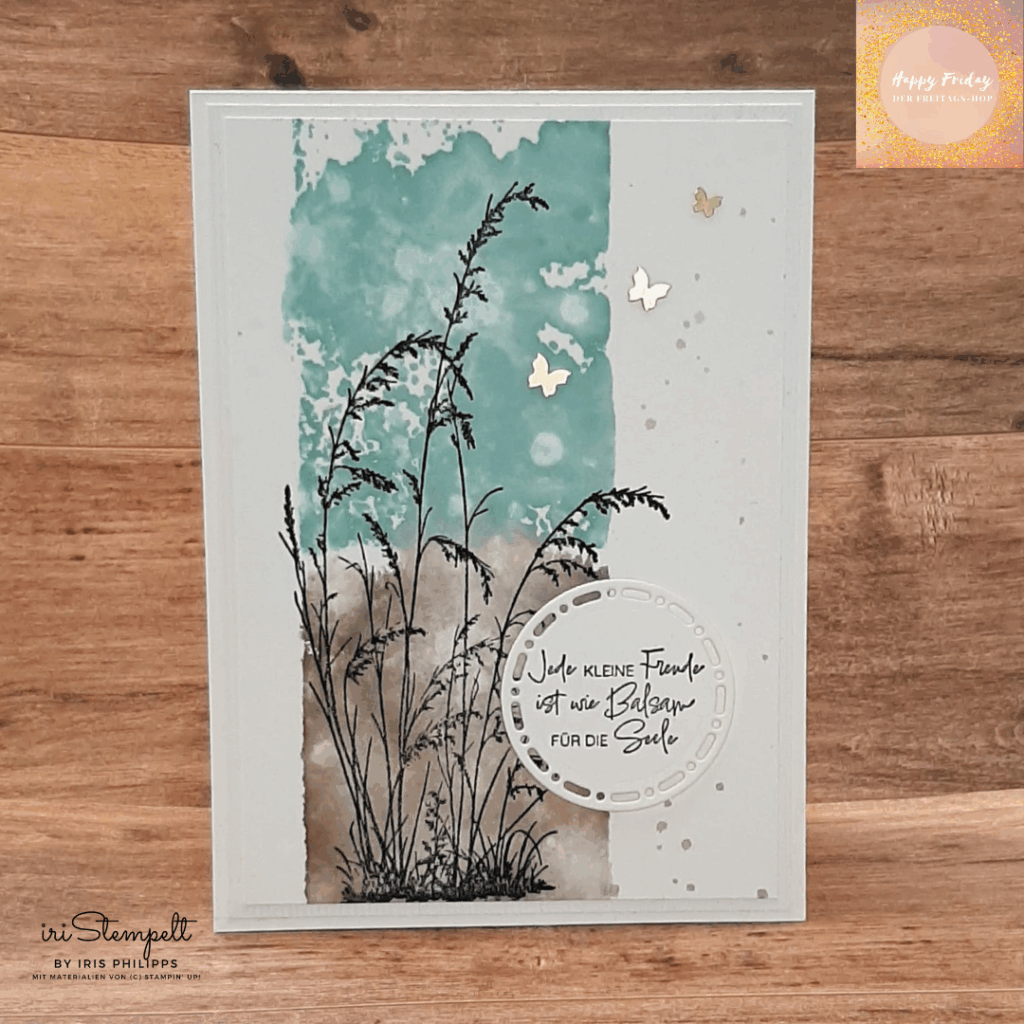 Im Rahmen des Happy Friday Bloghops zeige ich Euch heute eine Grusskarte in Acrylblock-Technik in den Farben Granit und Aquamarin. Gestempelt habe ich mit dem Stempelset „Präriegras“in der Farbe Tiefseeblau.