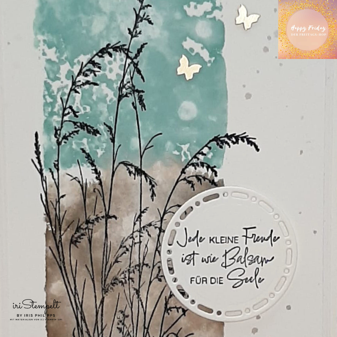Im Rahmen des Happy Friday Bloghops zeige ich Euch heute eine Grusskarte in Acrylblock-Technik in den Farben Granit und Aquamarin. Gestempelt habe ich mit dem Stempelset „Präriegras“in der Farbe Tiefseeblau.