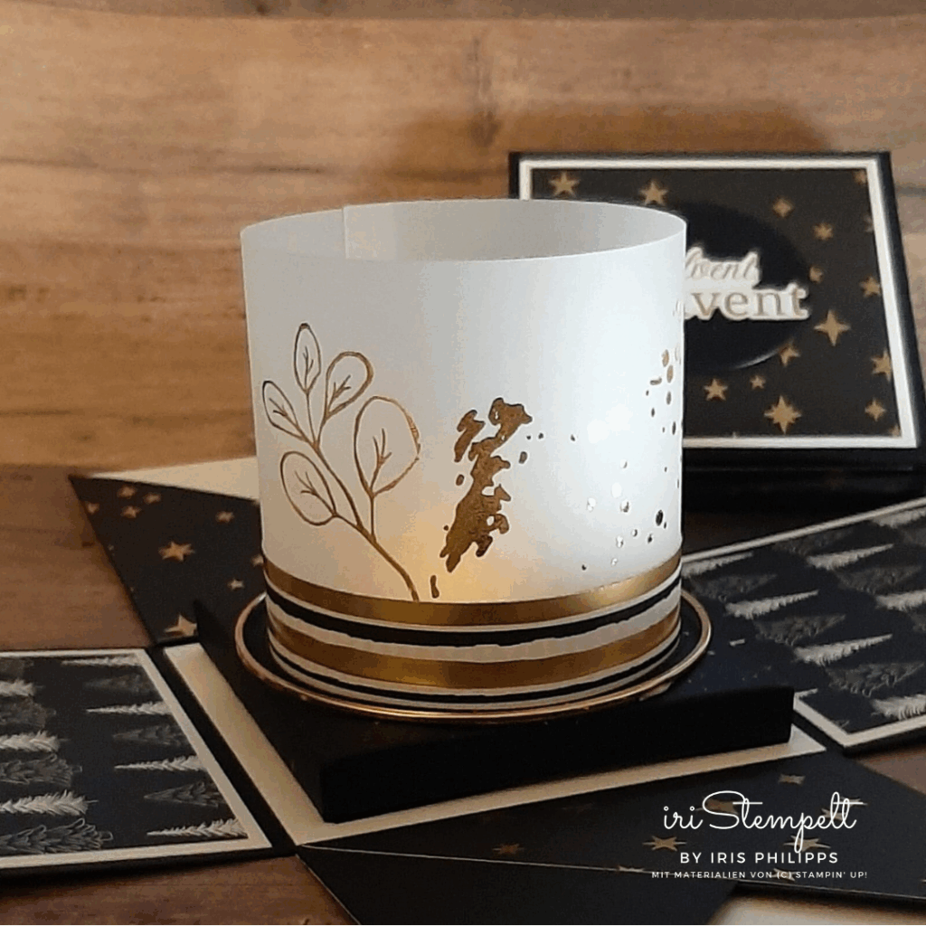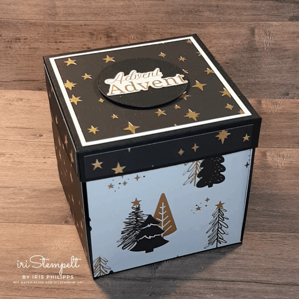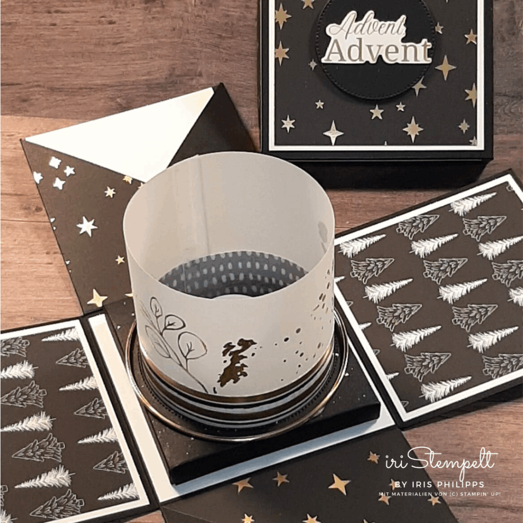 Im Rahmen des „Minihop reloaded“ zeige ich Euch heute eine Explosionsbox mit einem Teelichthalter im Inneren mit dem besonderen DSP „Moderne Weihnachten“ im „Mini-Hop reloaded“ mit Produkten von Stampin‘ Up!.