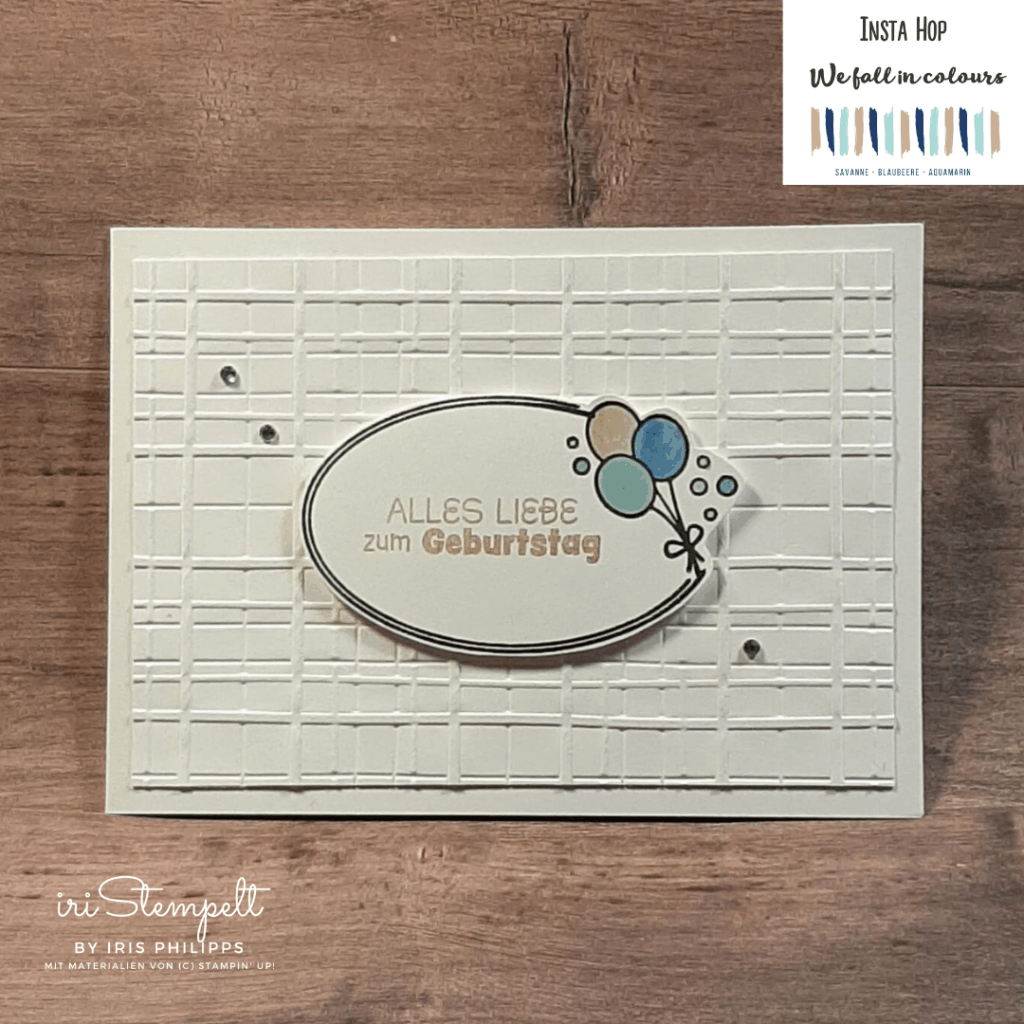Begonnen habe ich wie so oft mit einer Grundkarte in Grundweiss, die erste Mattung, ebenfalls in Grundweiss, habe ich mit der 3-D-Prägeform „Verspielte Karos“ geprägt und anschließend auf die Grundkarte geklebt. Danach habe ich aus dem Stempelset „Freupost“ (kommt ab dem 06.01.2026 im Minikatalog Januar bis April 2026) den ovalen Rahmen und die süßen Luftballons in Memento schwarz gestempelt und das Ganze per Hand ausgeschnitten. Die Luftballons habe ich in den Farben Savanne, Blaubeere und Aquamarin coloriert. Der Spruch ist in Savanne gestempelt und stammt aus dem Stempelset „Süsse Safari“. Das Oval habe ich final mit Dimensionals auf den „Karo“-Aufleger aufgebracht. Ein paar Basic-Strass-Schmucksteine runden die Karte ab. Alle verwendeten Materialien sind von der Firma Stampin‘ Up!.