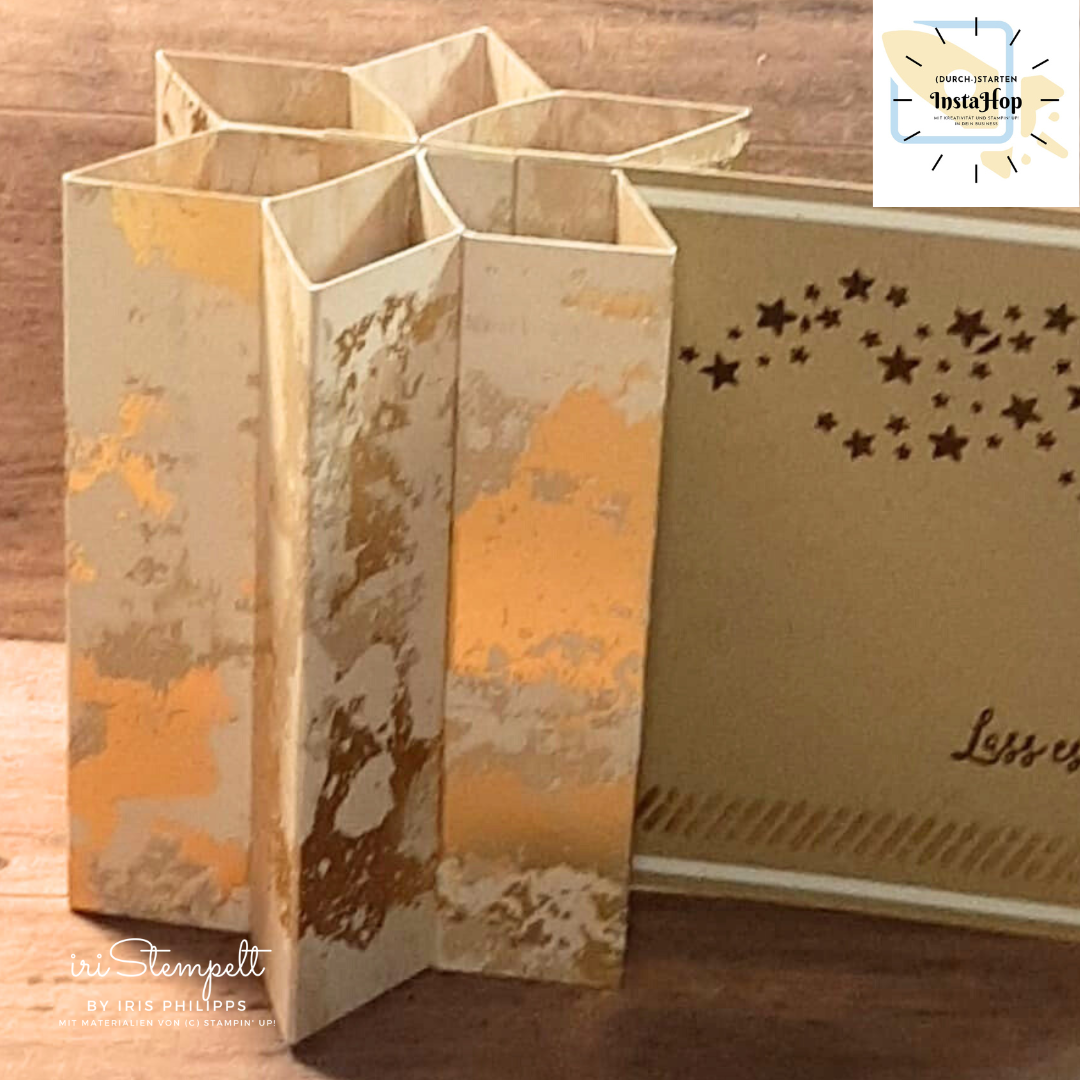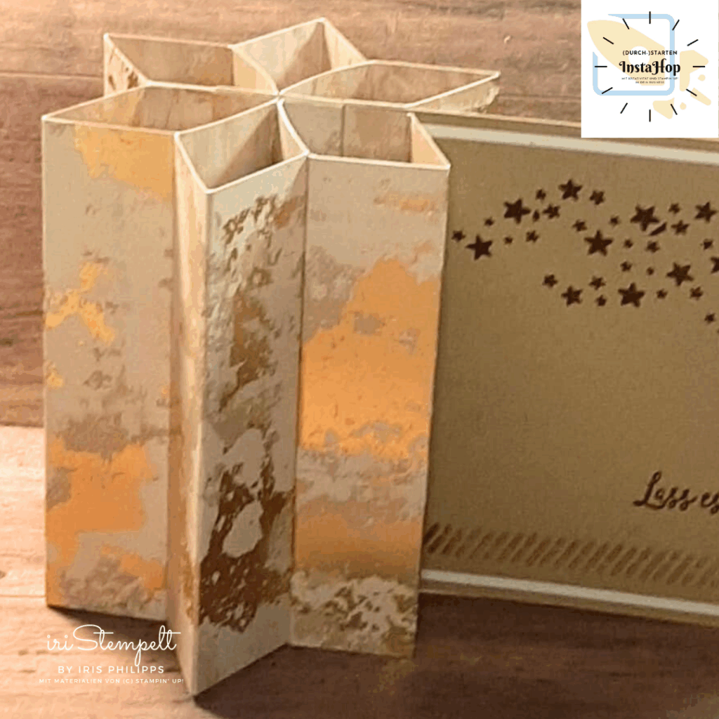 Genutzt habe ich Farbkarton Grundweiss und Savanne, Besonderes Designpapier „Elegante Weihnachtszeit“, Stempelset „Swirled Designs“ (die Sterne), Stempelset „Flockenpost“ (der Spruch) und die Rubbelbilder mit Metallic-Effekten – alle Produkte sind von Stampin‘ Up! .