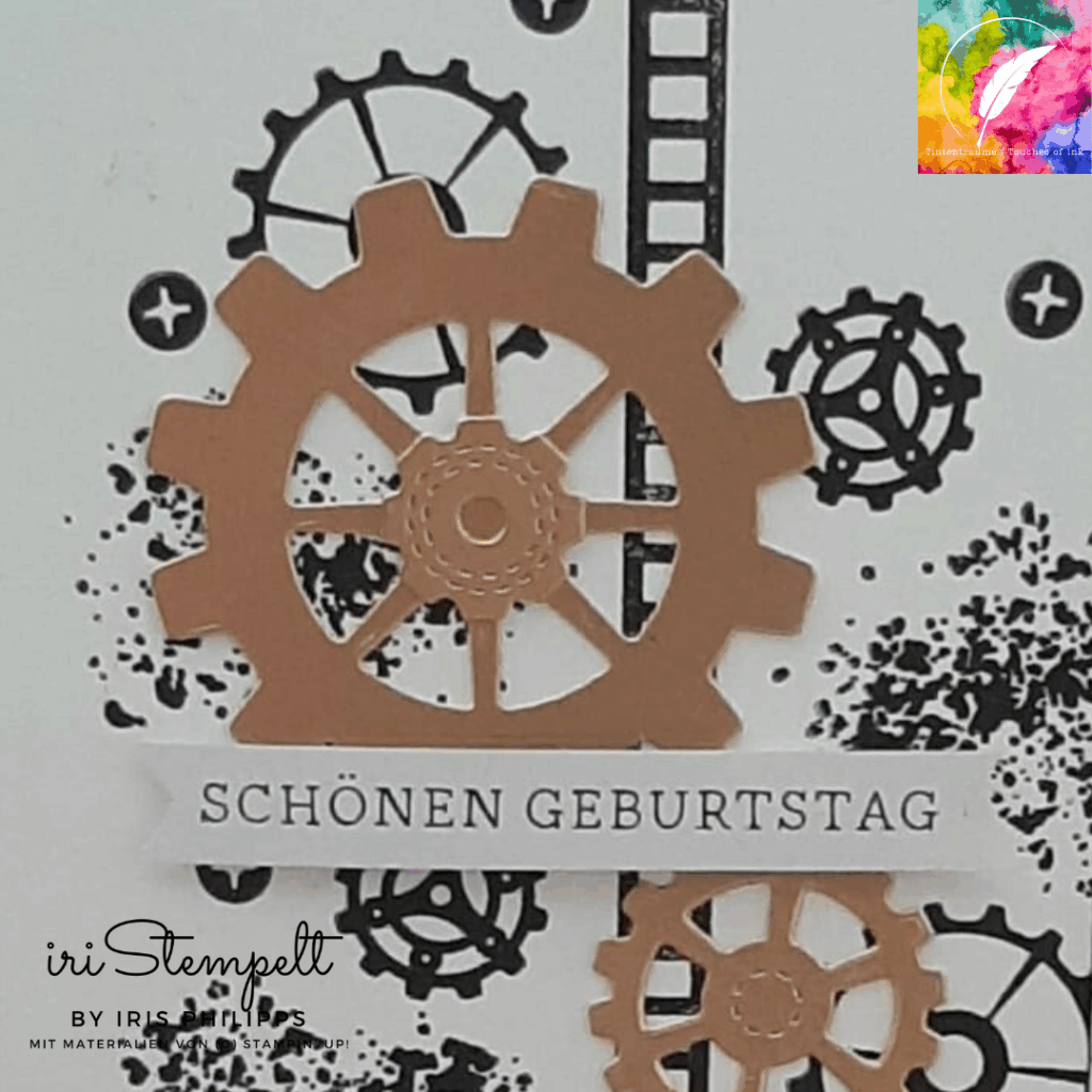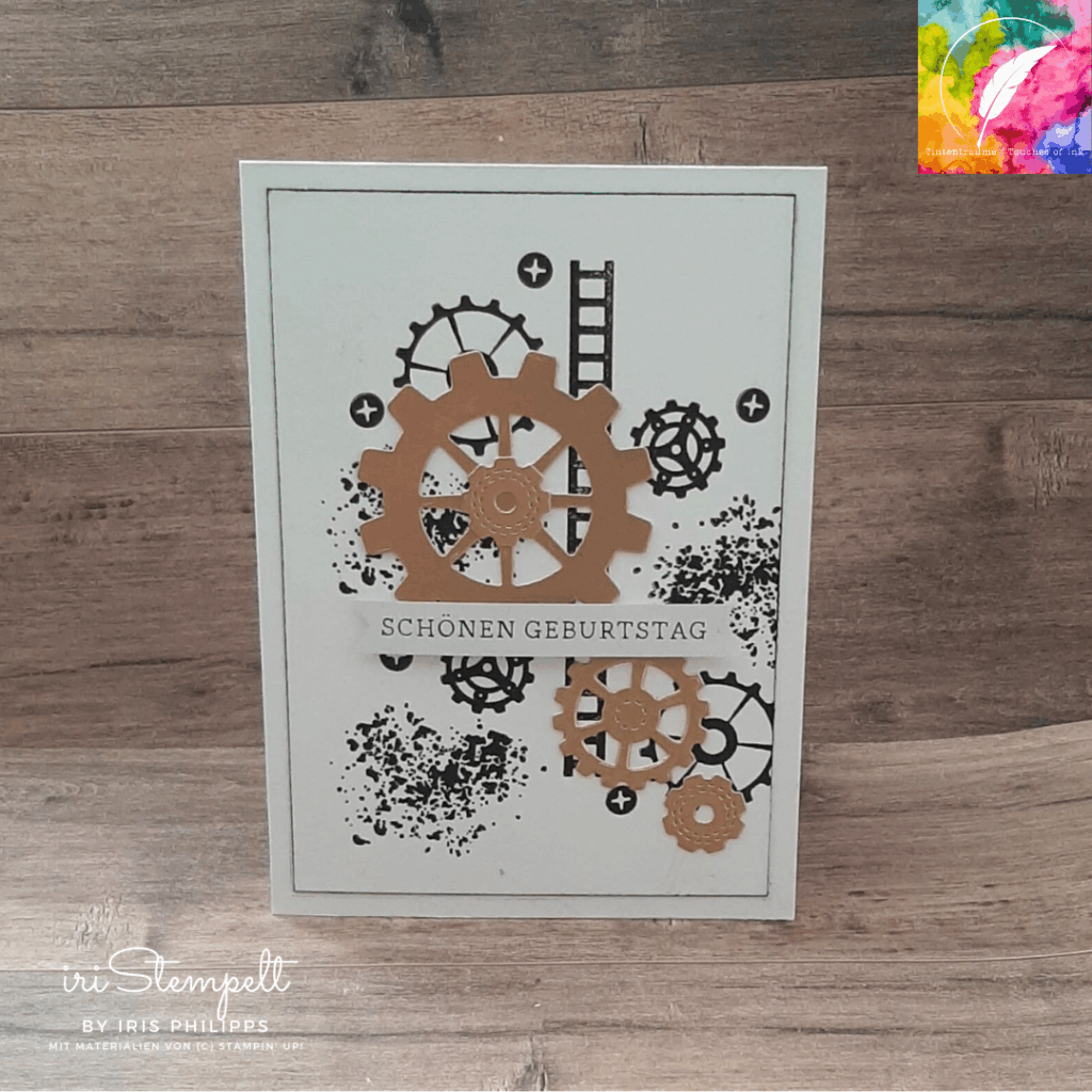Ich möchte Dir heute eine Geburtstagskarte mit dem Produkt-Paket „Gears & Textures“ aus dem Minikatalog 01-04/2026 mit Produkten von Stampin‘ Up! zeigen. Die Farben sind Grundweiss, Schwarz und Gold. Die Karte hat mein großer Sohn zu seinem 21. Geburtstag bekommen.