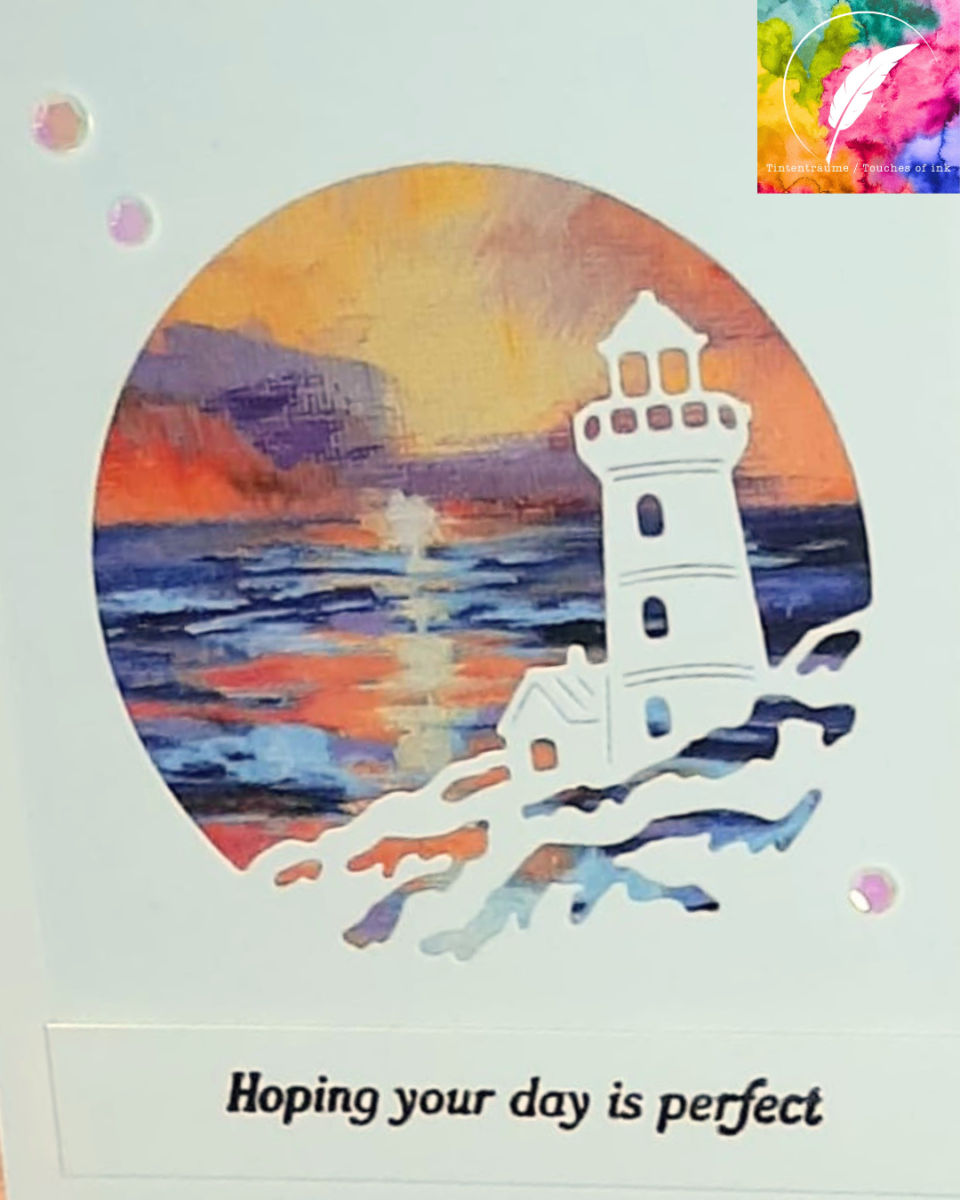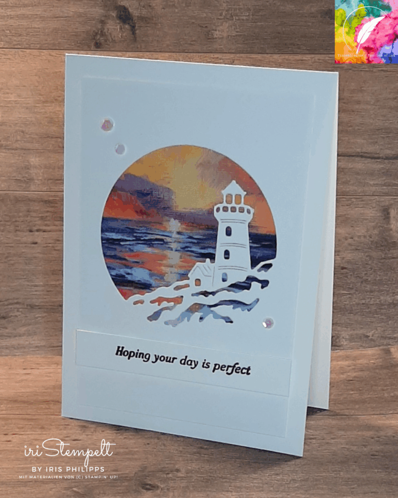 Ich habe aus der Reihe das wunderschöne, besondere Designpapier „Malerische Meeresküste“, die „Pailletten Abendglitzern am Meer“ und die Stanzformen genutzt.Und das Ganze mit einer grundweissen Karte mit grundweissem Aufleger, aus welchem ich das runde Element mit dem Leuchtturm ausgestanzt und mit dem wunderschönen Designppier hinterlegt habe. Einen Spruch in Tiefseeblau auf einen Streifen in Grundweiss gestempelt, mit Dimensionals aufgesetzt und verziert mit den Pailetten – und schon hat man mit wenig Mitteln und wenig Aufwand eine echt bezaubernde Karte.