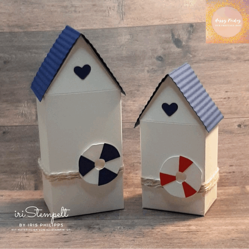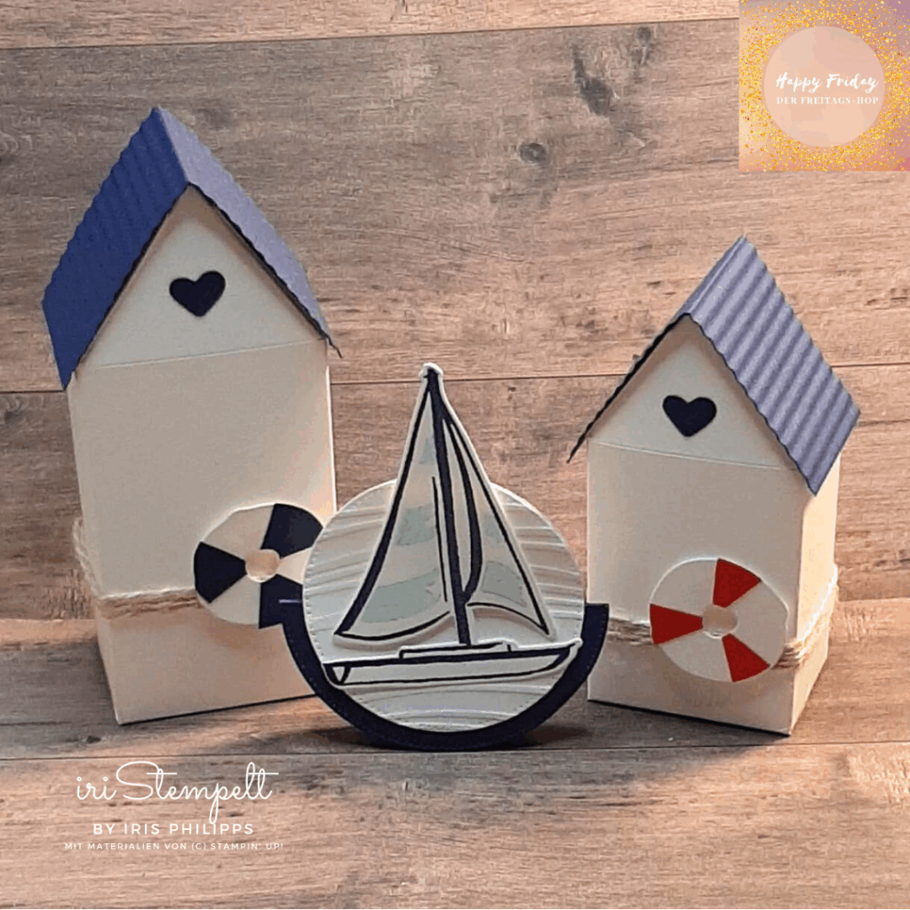 Im Rahmen des Happy Friday Bloghops zeige ich Euch heute meine sommerliche, kleine Dekoration bestehend aus zwei Badehäuschen und einer kleinen maritimen Wippkarte. Diese beiden Dinge haben wir im Mai 2025 auf dem „Stickytreat“ in Oldenburg gewerkelt. Das war so ein schöner Workshoptag mit lauter netten Mädels.