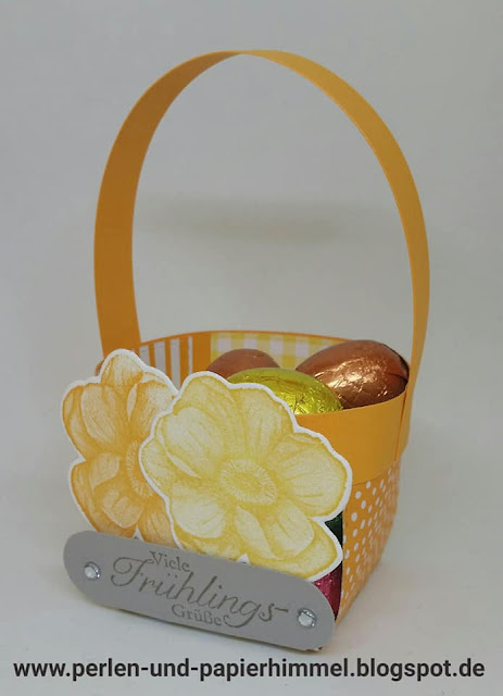 Und dann habe ich noch ein kleines Osterkörbchen gebastelt nach einer Anleitung von Jasmin Schulze – stempeldochmal. Sehr genial finde ich, dass es aus den Framelits „Bestickte Rechtecke“ zusammengesetzt wird.