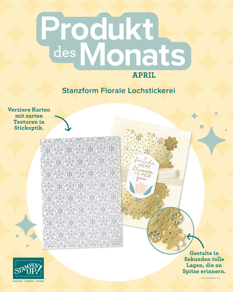 Wenn Dich exklusive Produkte begeistern, wirst Du das Produkt des Monats lieben! Im Rahmen dieses monatlichen Angebots erscheint jeweils ein neues, exklusives Produkt. Die Artikel beim „Produkt des Monats“ sind spezielle Produkte, die zu den besten von Stampin’ Up! gehören. Und sie sind weder in unseren Katalogen noch bei „Exklusiv online“ erhältlich. In jedem Monat erscheint ein neuer Artikel, der pro Stampin’ Up!-Konto nur einmal bestellbar ist. Die Produktmenge ist begrenzt, und er ist womöglich schnell ausverkauft. In diesem Fall kommt er nicht mehr zurück!